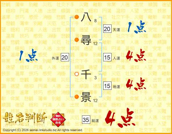 生活面を象徴する運勢です。外部から受ける影響力を表し、結婚運、家庭運や職場、環境への順応性を表します。総運から人運を引いた画数。姓や名が1文字の場合を除く。