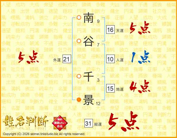 生活面を象徴する運勢です。外部から受ける影響力を表し、結婚運、家庭運や職場、環境への順応性を表します。総運から人運を引いた画数。姓や名が1文字の場合を除く。
