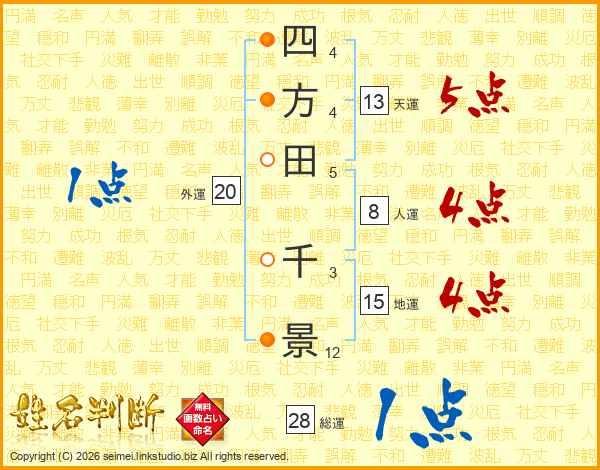 四(4画)方(4画)田(5画) 千(3画)景(12画)