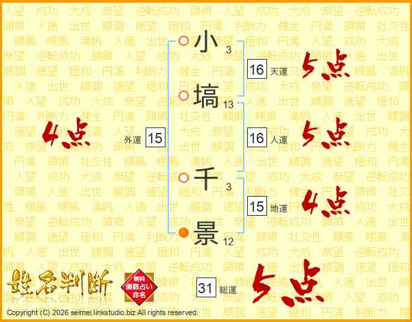 小(3画)塙(13画) 千(3画)景(12画)