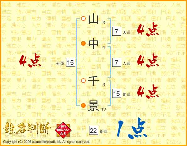 生活面を象徴する運勢です。外部から受ける影響力を表し、結婚運、家庭運や職場、環境への順応性を表します。総運から人運を引いた画数。姓や名が1文字の場合を除く。