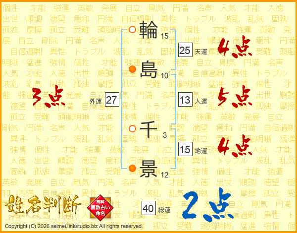 輪(15画)島(10画) 千(3画)景(12画)