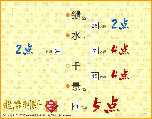 家系が持つ宿命的な運勢を表します。祖先から受け継いだ苗字ですので自分の力が及びません。家柄を象徴します。苗字の合計画数。