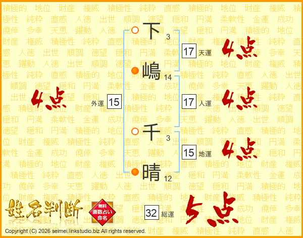 下(3画)嶋(14画) 千(3画)晴(12画)