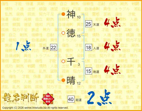 神(10画)徳(15画) 千(3画)晴(12画)