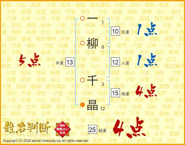 一(1画)柳(9画) 千(3画)晶(12画)