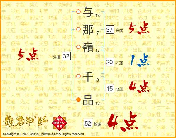 与(13画)那(7画)嶺(17画) 千(3画)晶(12画)
