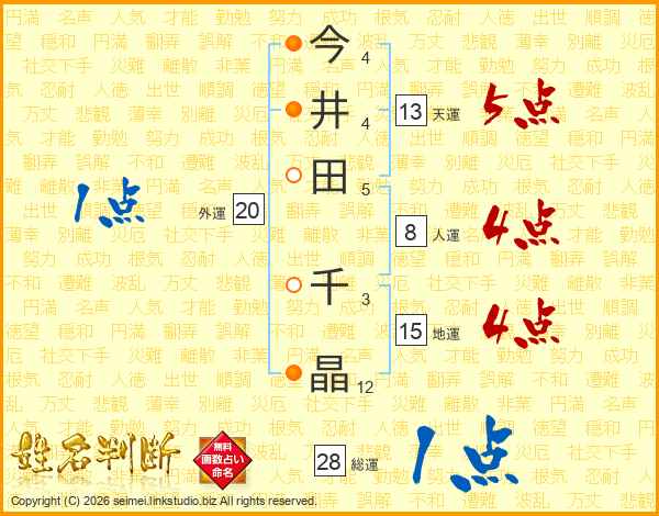 今(4画)井(4画)田(5画) 千(3画)晶(12画)