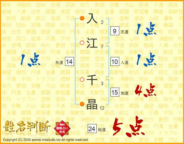 生活面を象徴する運勢です。外部から受ける影響力を表し、結婚運、家庭運や職場、環境への順応性を表します。総運から人運を引いた画数。姓や名が1文字の場合を除く。