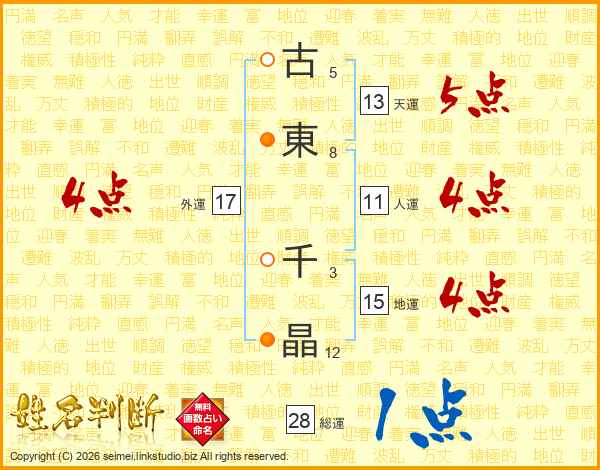 古(5画)東(8画) 千(3画)晶(12画)