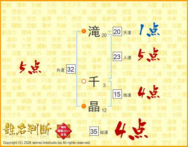生活面を象徴する運勢です。外部から受ける影響力を表し、結婚運、家庭運や職場、環境への順応性を表します。総運から人運を引いた画数。姓や名が1文字の場合を除く。