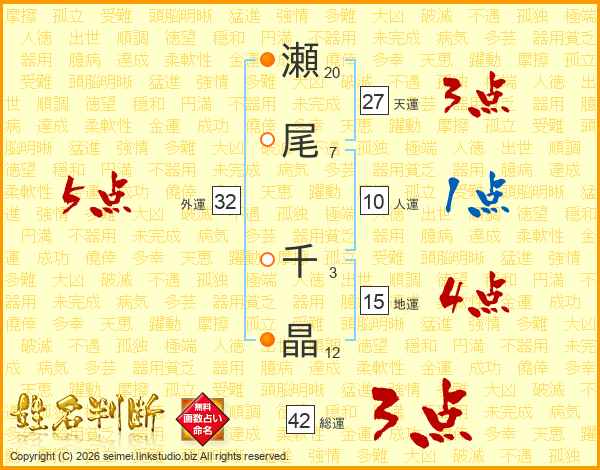 瀬(20画)尾(7画) 千(3画)晶(12画)