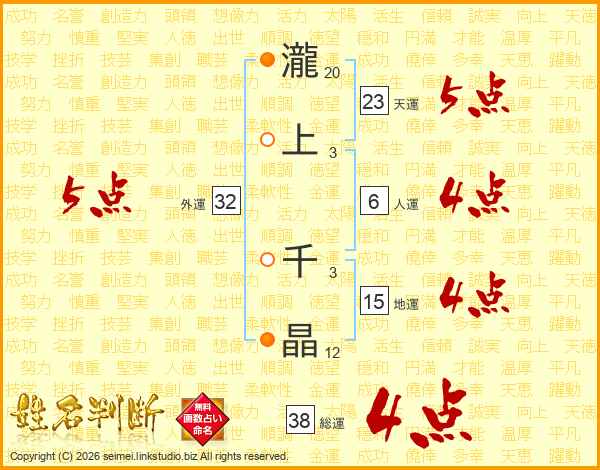 瀧上千晶さんの総運は38画の4点!