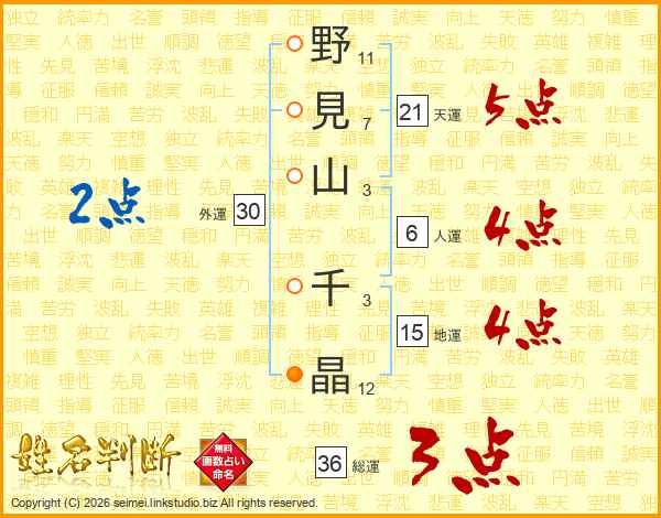 野(11画)見(7画)山(3画) 千(3画)晶(12画)