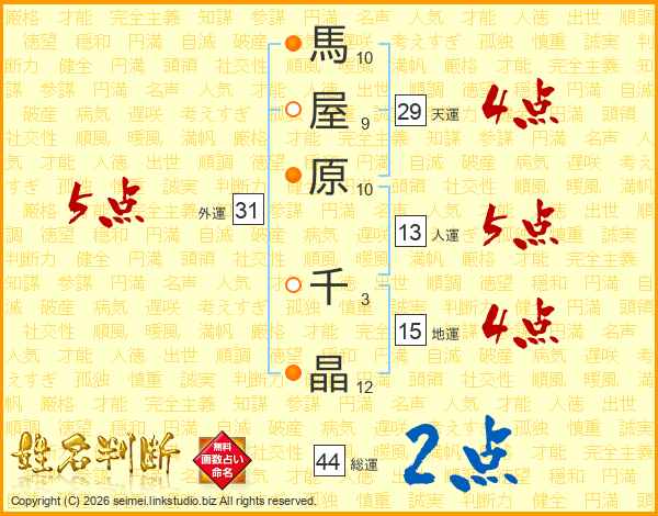 馬屋原千晶さんの総運は44画の2点!