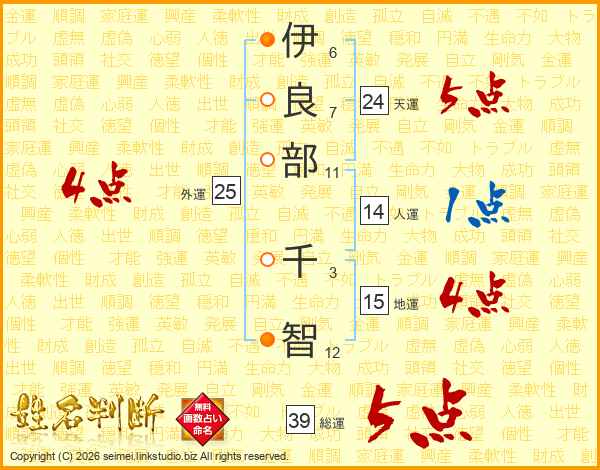 伊(6画)良(7画)部(11画) 千(3画)智(12画)