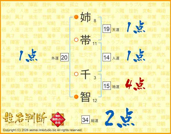 姉(8画)帯(11画) 千(3画)智(12画)
