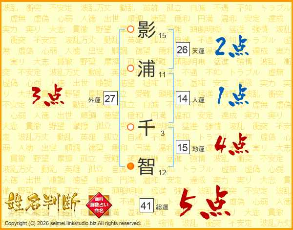 生活面を象徴する運勢です。外部から受ける影響力を表し、結婚運、家庭運や職場、環境への順応性を表します。総運から人運を引いた画数。姓や名が1文字の場合を除く。