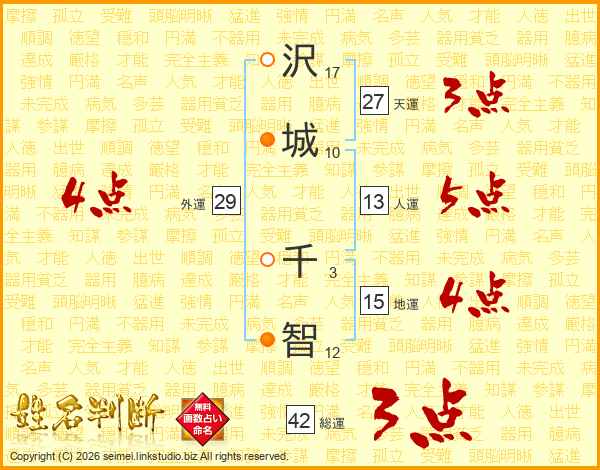 生活面を象徴する運勢です。外部から受ける影響力を表し、結婚運、家庭運や職場、環境への順応性を表します。総運から人運を引いた画数。姓や名が1文字の場合を除く。