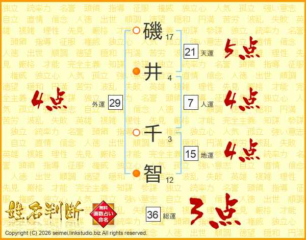 磯(17画)井(4画) 千(3画)智(12画)