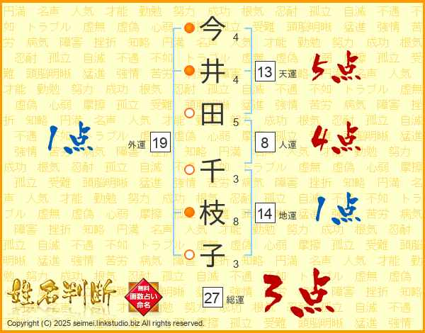 今(4画)井(4画)田(5画) 千(3画)枝(8画)子(3画)