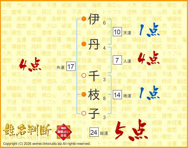 伊(6画)丹(4画) 千(3画)枝(8画)子(3画)