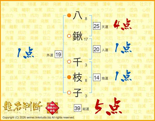 八鍬千枝子さんの総運は39画の5点!