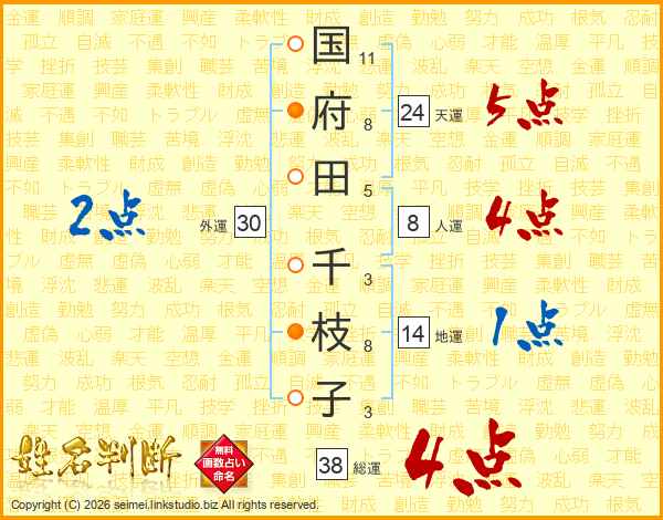 国(11画)府(8画)田(5画) 千(3画)枝(8画)子(3画)