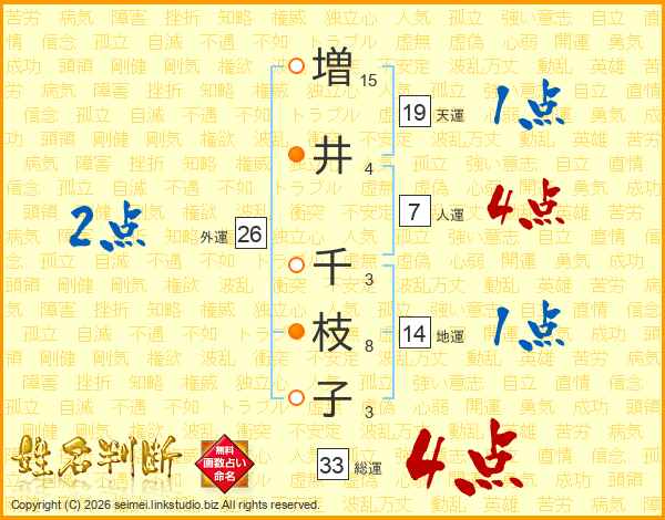 増(15画)井(4画) 千(3画)枝(8画)子(3画)