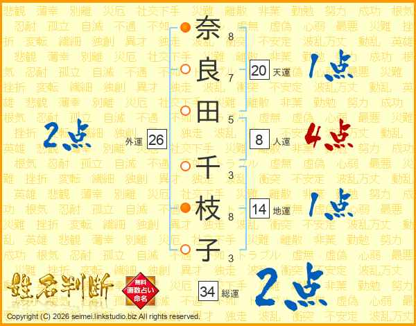 奈(8画)良(7画)田(5画) 千(3画)枝(8画)子(3画)