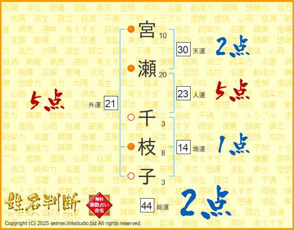 宮(10画)瀬(20画) 千(3画)枝(8画)子(3画)