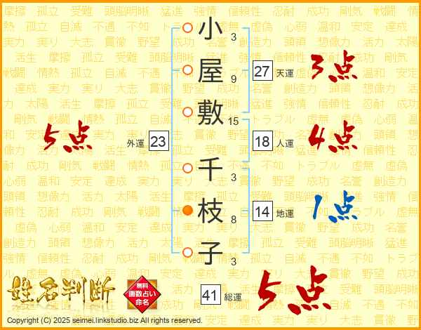 小(3画)屋(9画)敷(15画) 千(3画)枝(8画)子(3画)