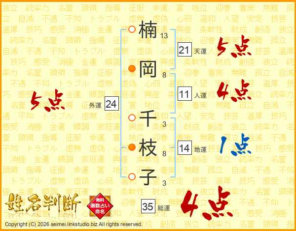楠(13画)岡(8画) 千(3画)枝(8画)子(3画)