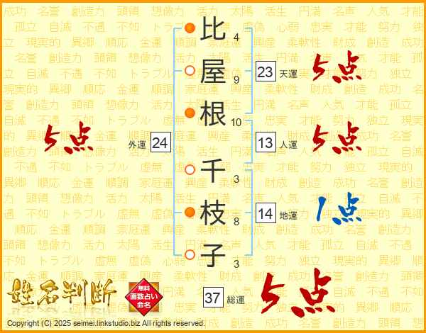 比(4画)屋(9画)根(10画) 千(3画)枝(8画)子(3画)