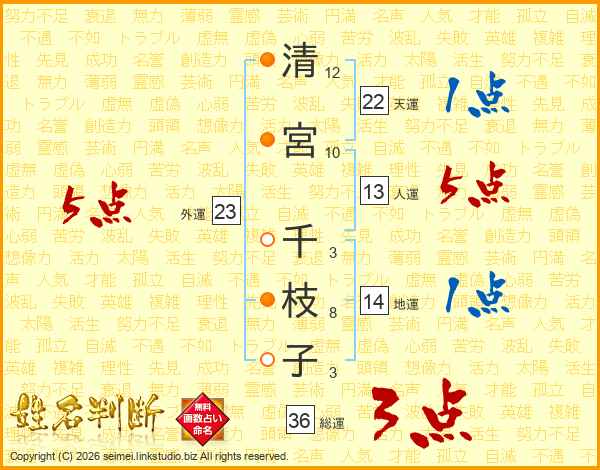 清(12画)宮(10画) 千(3画)枝(8画)子(3画)