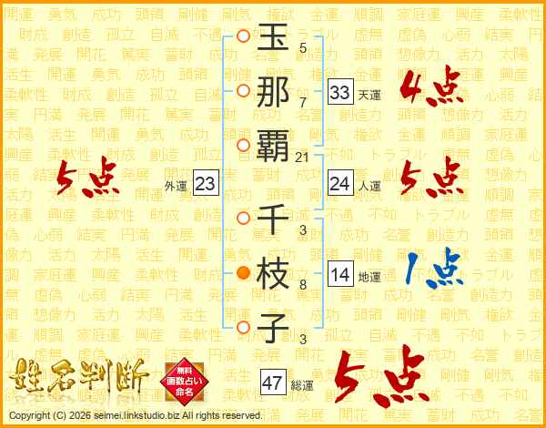 玉(5画)那(7画)覇(21画) 千(3画)枝(8画)子(3画)