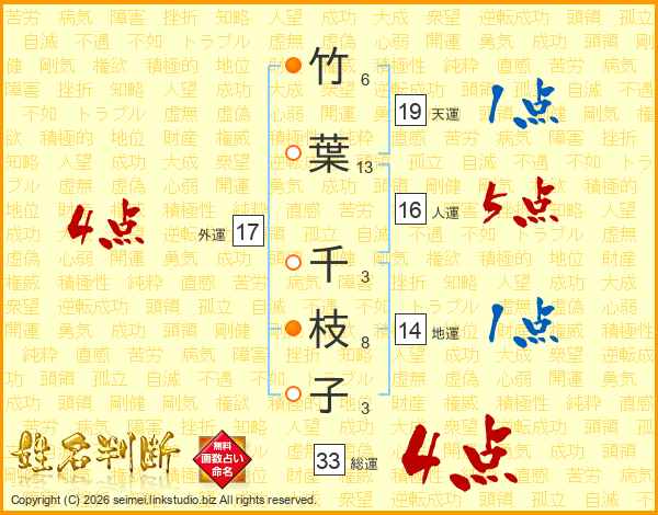 竹葉千枝子さんの総運は33画の4点!