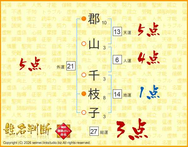 郡(10画)山(3画) 千(3画)枝(8画)子(3画)