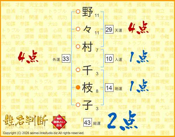 野々村千枝子さんの総運は43画の2点!