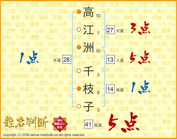 高(10画)江(7画)洲(10画) 千(3画)枝(8画)子(3画)