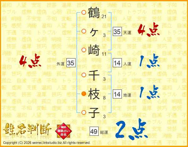 鶴ヶ崎千枝子さんの総運は49画の2点!