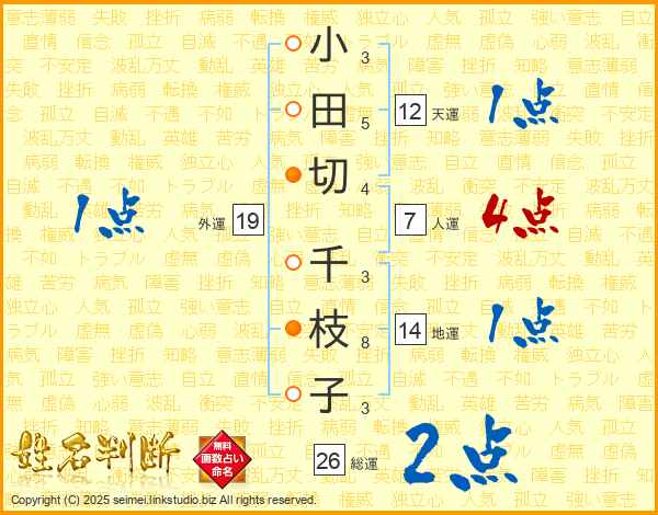 小(3画)田(5画)切(4画) 千(3画)枝(8画)子(3画)