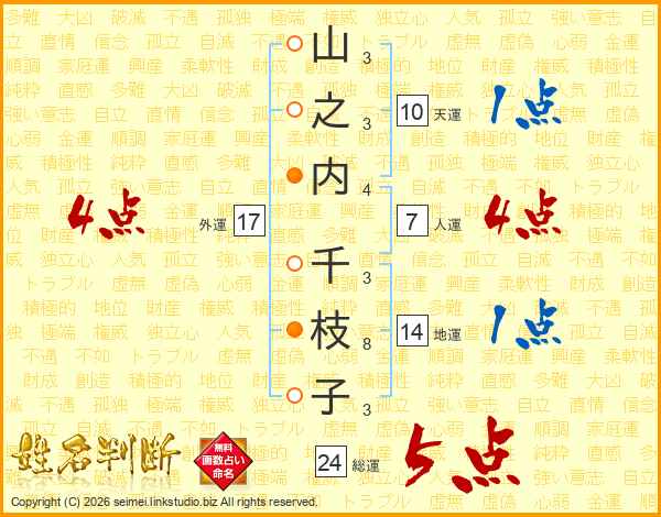 山(3画)之(3画)内(4画) 千(3画)枝(8画)子(3画)