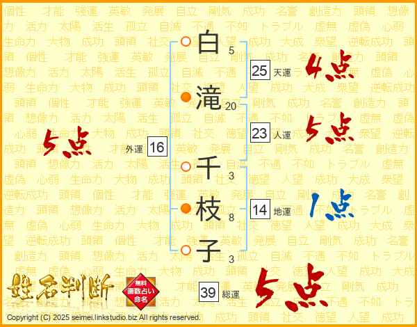 白(5画)滝(20画) 千(3画)枝(8画)子(3画)