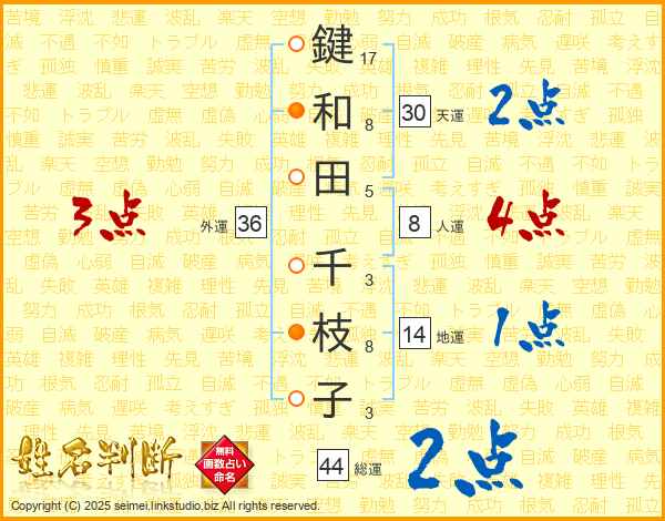 鍵(17画)和(8画)田(5画) 千(3画)枝(8画)子(3画)