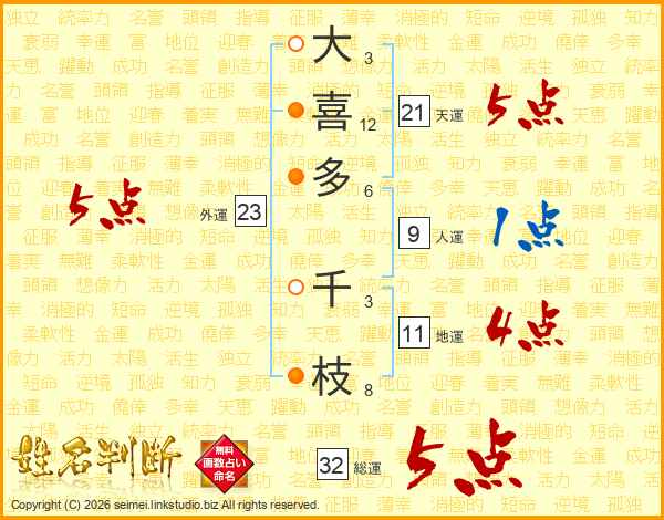 大(3画)喜(12画)多(6画) 千(3画)枝(8画)