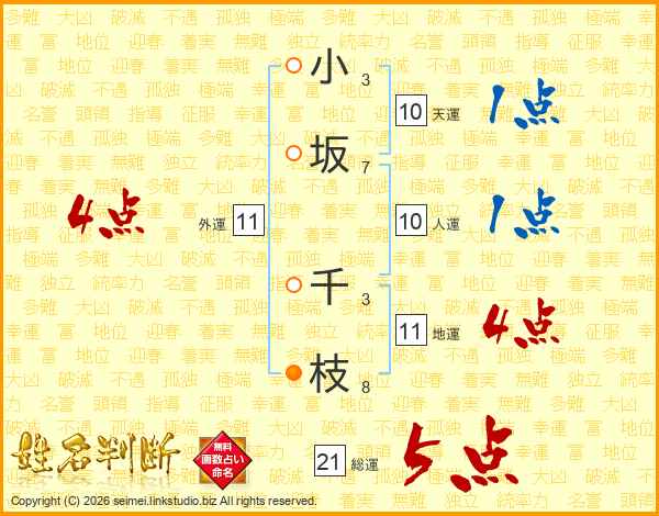小坂千枝さんの総運は21画の5点!