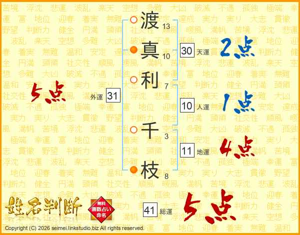 渡真利千枝さんの総運は41画の5点!