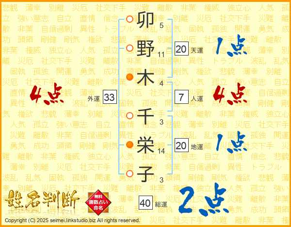 卯(5画)野(11画)木(4画) 千(3画)栄(14画)子(3画)
