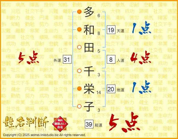 多和田千栄子さんの総運は39画の5点!